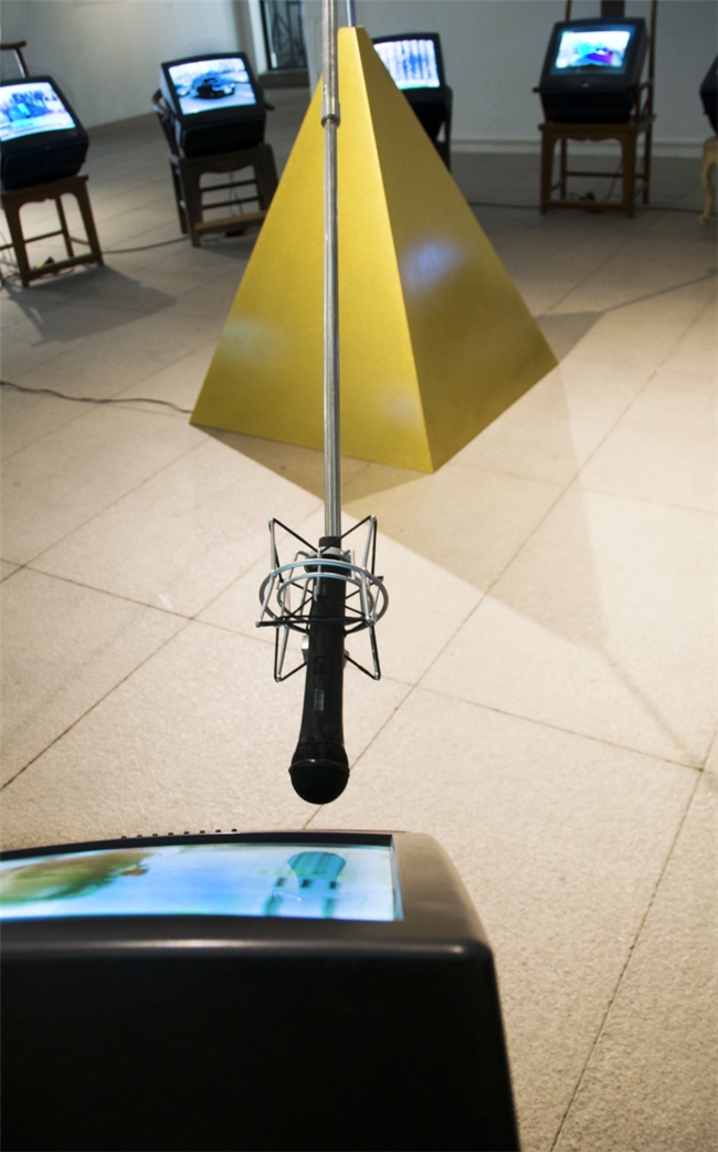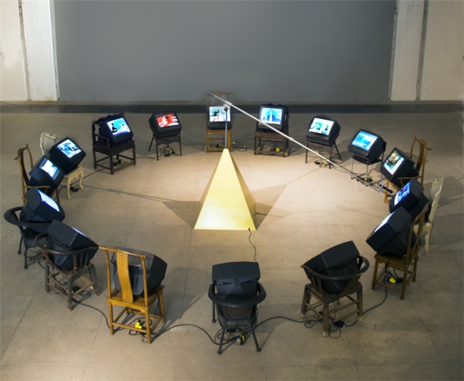 张琪凯的作品《360 度》,是他几年前的多媒体装置作品,同样阐释了一种国际间的“秩序关系学”的形态,十几台电视机滚动播出不同媒体的新闻播报,360 度随机转动的麦克风话筒短暂地停留在某一电视机前,把这一电视机所播放的内容声音放大,以此在给予话语权的同时,又迅速强行剥夺了话语权。这件作品以简洁明确而又反讽的方式,暗喻了当下国际环境中,国与国之间的博弈状态,探讨了话语权的统治地位在政治,经济,军事、艺术等领域中所起的作用。