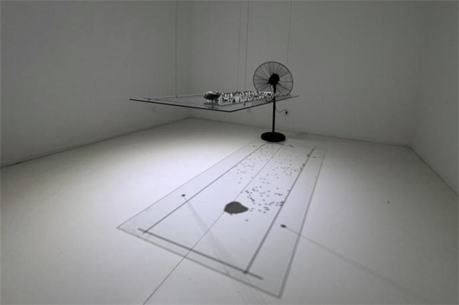 在作品《风动》中,张琪凯通过四根钢丝绳固定的长方形玻璃板,上面放置石头以及百余粒白色、黑色玻璃珠,在电风扇的左右摆动中,这些玻璃珠不断地被风吹到高处,又在没有风的时候落到低处。这些珠子滚动起来的感觉很像海浪,而这种“水”的意象恰好与“风”形成了一种微妙的关系,这是否体现出了中国古代哲学中五行相生相克的思想呢?