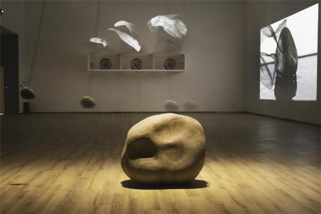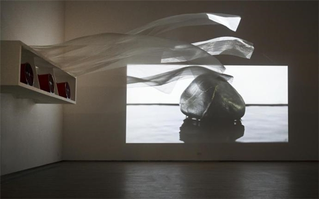 在空间营造方面,同样体现着张琪凯的“克制”,不堆砌,不拼凑,他以“借景”“留白”等理念,通过装置的虚实对比、光影层次,构建出具有“空灵之境”的感知场域。如在作品《漱石》中,他利用被鼓风机吹起的轻纱,被投影照射下形成的影子,轻轻“抚摸 ”着影像中的石头并让水面泛起涟漪。这种空间营造方式和虚实重叠的幻想,既符合东方审美的营造方式又具有当代艺术的实验性特征。